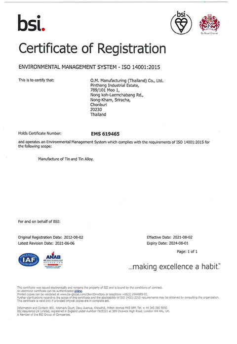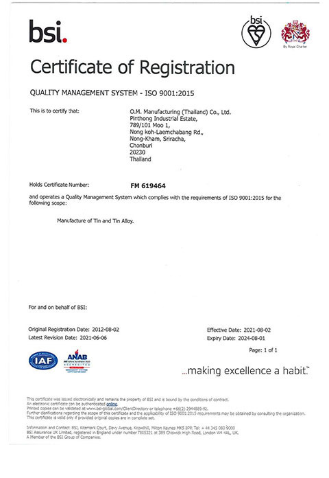 บริษัท โอ.เอ็ม. แมนูแฟคเจอริ่ง (ประเทศไทย) จำกัด ก่อตั้งเมื่อปีค.ศ. 2005 เรารับซื้อเศษดีบุก และเศษดีบุกผสมทุกประเภท โดยให้ความสำคัญกับการวิเคราะห์ส่วนประกอบ ด้วยเครื่องตรวจสอบที่มีประสิทธิภาพได้รับมาตราฐานสากล เราเสนอราคาอย่างยุติธรรมโดยอ้างอิงผลการวิเคราะห์ และราคาตลาดโลหะซึ่งเป็นที่ยอมรับทั่วโลก มาผ่านกระบวนการคัดแยก สกัดโลหะ และนำกลับมาใช้ประโยชน์ใหม่ ด้วยเทคโนโลยีจากประเทศญี่ปุ่น ที่สั่งสมประสบการณ์มาตั้งแต่ปีค.ศ. 1950